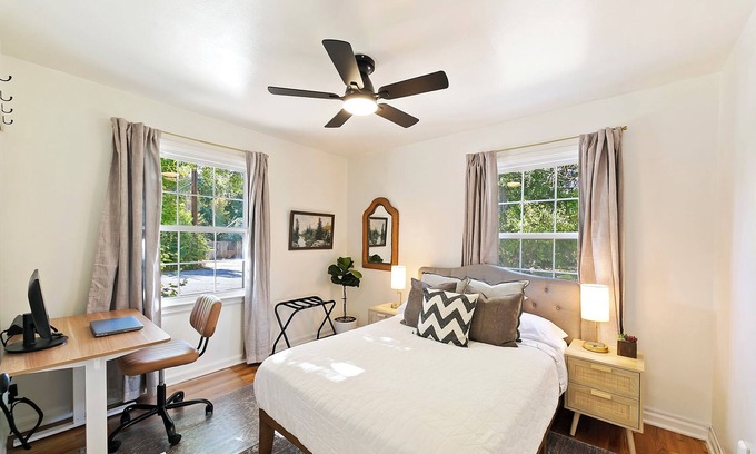 Welcome to our charming 1950s Cottage in the heart of Boise's historical district! We’re so excited to have you here. Our cozy home features a comfortable Full Bed with a spacious closet and an electric standing desk—perfect for catching up on work or enjoying some downtime. You’ll also find a lovely Queen Bed, complete with a closet, drawers, and a full-length mirror to help you get ready for your day.