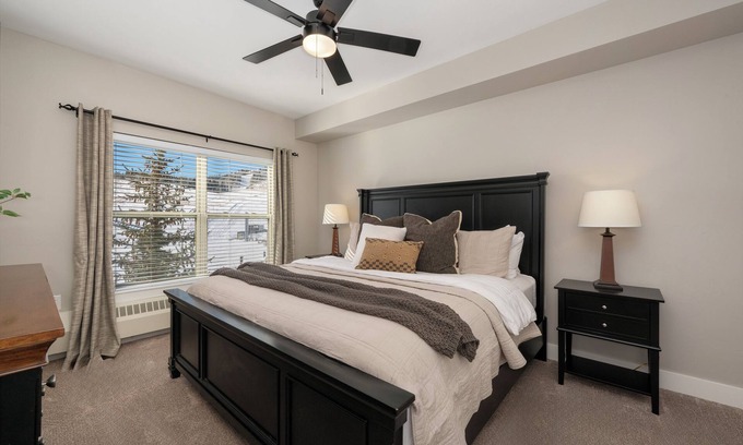 Our condo is located directly next to the ski base, steps from the ski lift. This property sleeps 4 comfortably, featuring a king bed and two twin XL beds. Perfect for a small group of guests. Enjoy the convenience of a washer/dryer machine, WiFi, and heating during a winter stay, and portable AC during your summer visit. The kitchen is fully equipped for your convenience. A ski locker is provided to store your ski equipment during your stay, and additional storage is available in the parking garage for items such as sleds, bikes, and paddle boards.