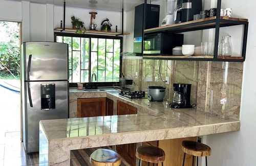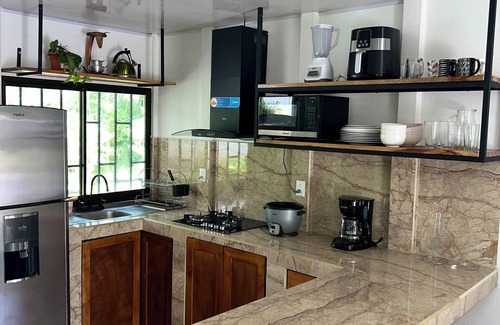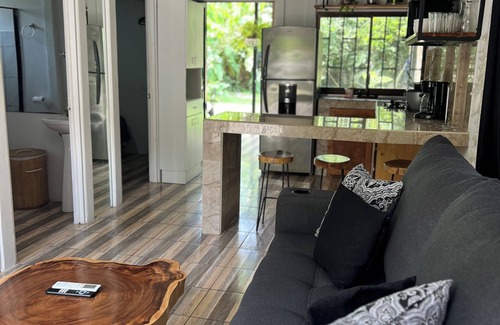 Located in Cañaza, 10 minutes away from the beach, and 20 minutes from puerto Jiménez, enjoy what this 2-bedroom villa has to offer. With 1 queen bed and 1 full bed, guests can relax in the lovely living room with an additional queen bed. The bathroom is equipped with a shower and a hairdryer. This cool property also includes amenities like a washing machine, AC, iron, and WiFi. Enjoy your time in Cañaza at our villa.