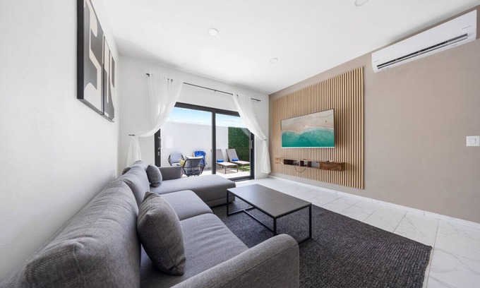 Gather for meals in the stylish dining area or on the private patio. Prepare your favorite dishes in the fully equipped gourmet kitchen, featuring sleek appliances and plenty of space for cooking and entertaining. Afterward, unwind and relax in the comfortable living room or enjoy a refreshing dip in the pool, perfect for cooling off in Aruba’s tropical climate.
