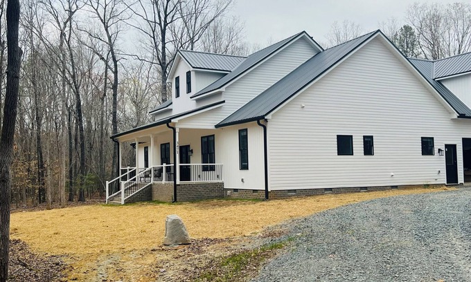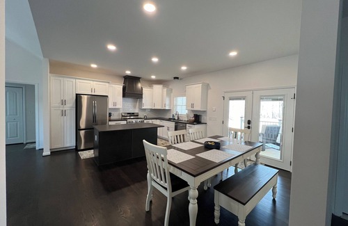 Grange Hall Retreat is a family friendly new construction home with plenty of space on a quiet wooded lot. 3 bedrooms with a tiny nursery (full size crib and changing table). Inflatable toddler beds and additional pack-n-play also available.
