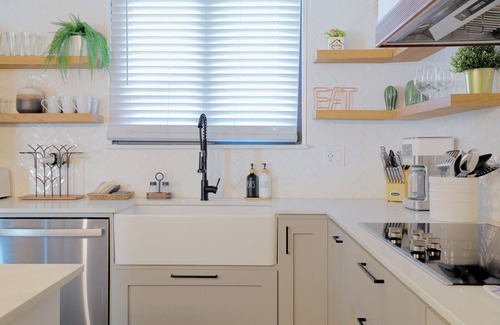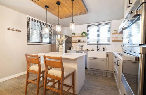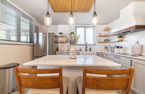 Inside, the apartment is designed to feel like home, with modern farmhouse decor, natural light pouring in from doors and windows, and spacious open-plan living. The family room features a plush L-shaped sofa and a 70” HDTV with streaming services like Netflix, Hulu, and HBO GO, ensuring your evenings are filled with entertainment and relaxation. The living room features a large comfortable sofa and a chair with enough lighting for a quite and relaxing reading time.