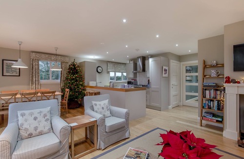 In the sitting room area, there's a corner sofa, three armchairs around the electric wood burner style fire and a 40" Smart television.