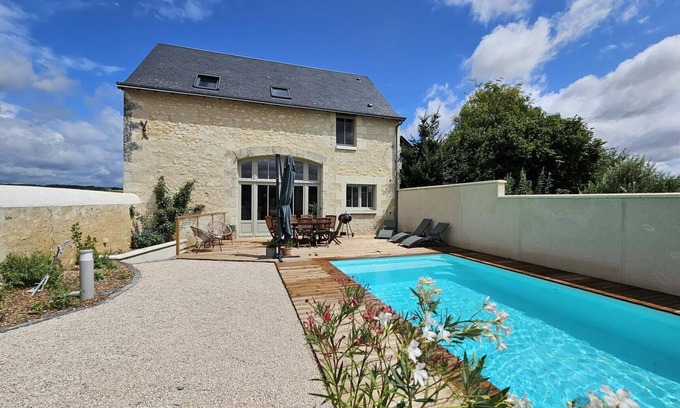 All-inclusive cottage (except tourist tax). Ground floor: Living room/kitchen (5-burner gas hob, oven, Nespresso coffee machine), shower room, separate toilet. Upstairs: 1 bedroom (1 bed 160x200cm), 1 bedroom (1 bed 160x200cm), 1 bedroom (2 twin beds 80x190cm), shower room with toilet. Wifi. Heating included (pellet and electric stove). Unfenced garden with private, unheated outdoor swimming pool (6 x 3.50 x 0.50 to 1.50 m). On-site parking with a 2.2 kW electric vehicle charging station (extra charge depending on consumption). 1 mountain bike + 1 adult mountain bike available free of charge. Non-smoking accommodation. POOL OPEN: from 01/06 to 30/09. Between the Loire Valley châteaux and the vineyards of southern Touraine, this cottage for 6 people welcomes you to a peaceful, green setting in Avon-les-Roches. Spacious, bright, and fully equipped, it is ideal for a stay with family or friends. The private outdoor pool, bordered by fields, invites you to relax on sunny days. Enjoy the terrace, barbecue, and cozy interior to savor every moment in complete simplicity. Nearby, discover the region's gems: Azay-le-Rideau, Chinon, Richelieu, wine cellars, charming villages, or strolls along the Vienne River. Hiking, gourmet markets, cultural visits, or naps by the water... Here, you can slow down, breathe, and enjoy the best of Touraine, between nature and heritage.