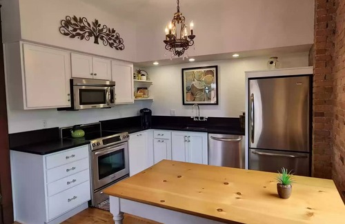 Charming and historic 1 Bedroom, 1 Full Bath condo in downtown Whitefish! You will not find a more warm and inviting space. Sleeps 2+, has Beautiful Mountain Views, and is walking distance to everything downtown Whitefish has to offer. This condo features a king-size bed with luxury linens, down comforter and pillows. A nook is provided for reading or an afternoon nap. The bath is complete with an open glass shower, subway tile, antique sink and plush towels. The gourmet kitchen includes everything needed for all your dining needs. You will enjoy cooking on a stove that includes a convection oven and microwave. A full-size dishwasher and stainless steel refrigerator are located on an original brick wall with a full size dining table that seats 6. A full-size washer and dryer are located inside the unit with laundry detergent provided. The living area is furnished with a 55’' flat screen TV and wireless internet to enjoy while relaxing on the comfortable leather couch. Enjoy beautiful Big Mountain views from every floor to ceiling window!
