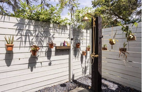 We are very relaxed and welcoming hosts and our place is gay and straight friendly. We enjoy to meet people from all over the world and make eventually new friends. This listing is our Red Barn in our very private backyard. The Barn is fully equipped with a Queen size bed, small Bathroom (Toilet and Sink inside). The amazing Hot Water Outdoor Shower is attached and has it own private entrance. In case the weather is not good, we have an Outdoor Bathroom which you can use. You have your own Coffee Station (Coffee and Tea is provided), Microwave, Mini Fridge, Bath ropes, Smart TV, Parking and an Outdoor Grill. You have access to all the outdoor Facilities, Pool and Spa is heated. The Barn offers an extra Twin Bed in the Loft, in case you are 3 People. We do have another Room for rent, so get together and hangout at the pool. Clothing is optional.