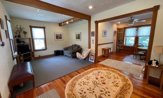 Experience Titusville in this charming 1-bedroom turn of the century bungalow 50 yards from the Delaware canal and river. The home is nestled on a quite street that bridges the Delaware canal and the Delaware river in the historic village of Titusville. It is the first street from scenic Washington Crossing park and a short walk from other park activities. Enjoy walking or biking on the tow path, kayaking in the canal or the river, exploring nearby Lambertville, New Hope and Princeton or just enjoying the evening on the screened in porch or relaxing on he back deck. Philadelphia is about a half hour drive south. Have the feel of being far away but in the convenience of restaurants and shopping. This has been my home of 25 years and I have recently relocated. It has not been renovated recently, but it is relatively updated. Due to a heavy workload, there is some deferred maintenance but it is a relatively modern home (central air, updated lighting, ceiling fans, new range). The front room of the house has a well lit, sunny laptop ready office. The kitchen is small but well stocked (and includes a full sized range, oven, and microwave, Keurig, for coffee). There is a full size washer and dryer. We offer linens and towels for convenience. You're sure to make fantastic memories with a stay at our place.