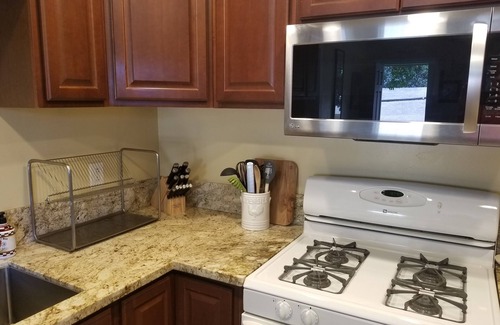 Newly remodeled, fully furnished guest house in Napa. Inquire for availability. Rare and great opportunity for monthly stays in wine country. Only a 5 minute drive to downtown. Views of open land and mature oaks provide a country setting close to town. Located on an acre near a park. Large detached main house is nearby but still offers privacy to guests. Owners are easily available via phone, email or text and happy to assist in any way. The unit offers fully equipped separate kitchen with seating for 4. Newly remodeled full bath has lots of storage. Stacked washer and dryer located indoors provided. Queen bed and queen sleeper sofa provided. The area around the property has occasional visiting wildlife. Hiking, mountain biking, frisbee golf course and seasonal archery field are all located near the property. House is located 3 miles south east from downtown Napa. Uber and Lyft is popular and available if needed. Napa wine train and Oxbow Market are located 3 miles away. Unit is good for couples, solo adventurers and business travelers. Small families are welcome. RV parking is available with guest house rental at an additional daily charge. ( No hook ups available). New heating and air conditioning unit recently installed. There is a small backyard patio with outdoor seating and BBQ.