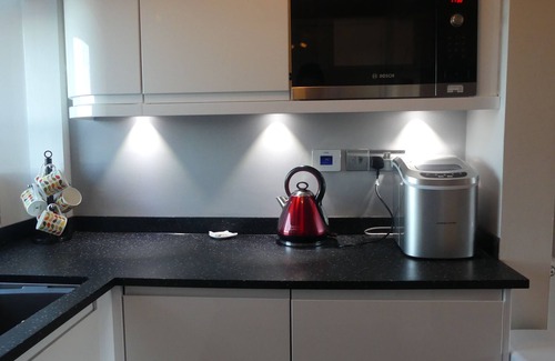 The kitchen has a fridge, a dishwasher, washing machine / dryer, a hob, an oven, a kettle, an ice-maker and a microwave.