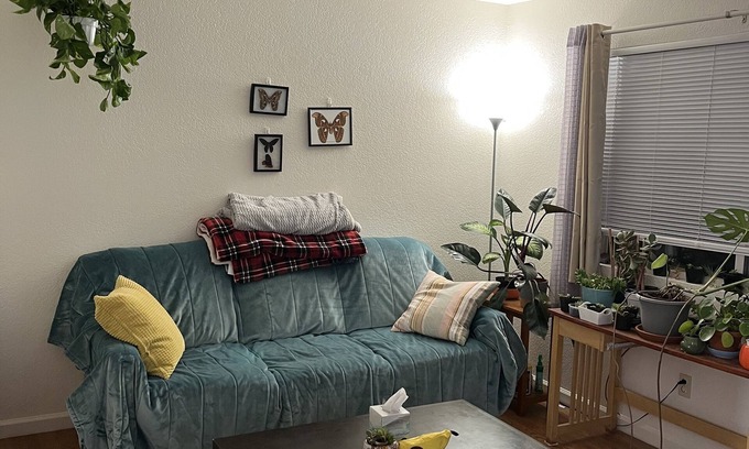 First level of a duplex. Separate, private entrances, and gated. Landlord resides in main house. Property manager offsite. 2 bedroom, 1 full bath, full kitchen, washer+dryer, and two parking spaces. Fully furnished with couch, king bed (linens+pillows), coffee table, TV, and many more. Free Wifi! House plant care required!!!