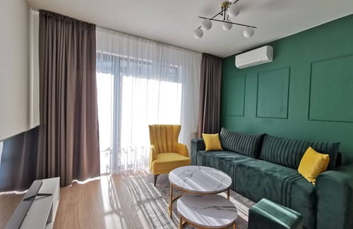 This stylish space is thoughtfully curated with high-end furnishings and impeccable attention to detail. The apartment features a cozy bedroom with a plush velvet bed, a spacious living room with a vibrant color scheme, and an abundance of natural light pouring through the large windows.