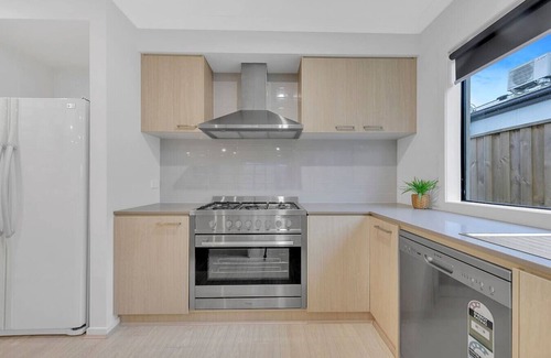 The fully-equipped kitchen is a culinary delight, featuring top-of-the-line appliances including a large fridge, gas cooktop, and oven. Whether you're preparing a quick breakfast or a gourmet dinner, you'll find all the essentials at your fingertips. The kitchen’s island bench is perfect for casual dining or enjoying a glass of wine while cooking.