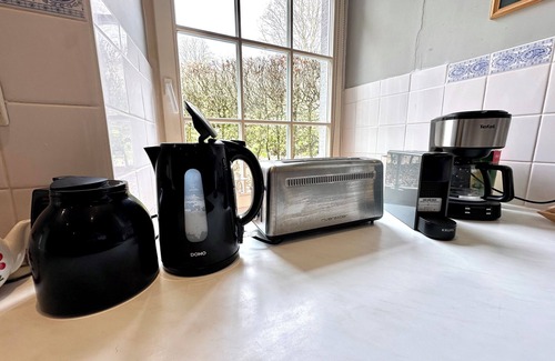 Ground floor: (Sitting room(TV, stove(wood), DVD player), dining room(dining table), Kitchen(hob(4 ring stoves, ceramic), electric kettle, toaster, coffee machine(filter), oven(electric), microwave, dishwasher, fridge, fridge, freezer, Juicer, Blender), toilet, washing room(tumble dryer, washing machine, vacuum cleaner, ironing board, iron))