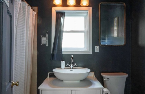 The full bathroom separates the bedrooms upstairs; it comes full with a shower/tub set up. We provide complimentary shampoo, body wash, and conditioner from Public Goods. There is plenty of shelving and drawer space for guest storage. The second bathroom is downstairs next the kitchen and comes with a full shower.