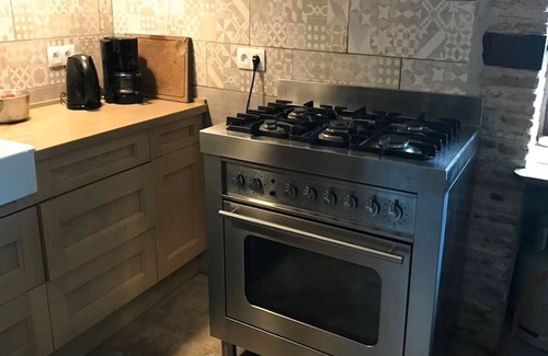 Ground floor: (open kitchen(electric kettle, toaster, cooker(6 ring stoves, gas), hood, coffee machine(filter), oven(electric), dishwasher, fridge-freezer, Blender), Living/diningroom(dining table, stove(wood), seating area), pantry(toilet, washing machine))