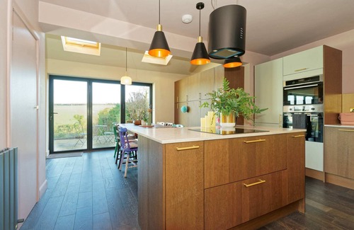 The open-plan living area boasts two trifold windows opening out onto a large patio, perfect for summer BBQs or cosy evenings by the fire pit. The kitchen is fully equipped, complete with a dishwasher for ease, and the dining area features a beautiful wooden table for meals together. On cooler evenings, relax by the wood burner with the added comfort of heated floors. The snug living room and playroom also offer a sofa bed for two additional guests. For entertainment, enjoy the Smart TV, board games, and books.