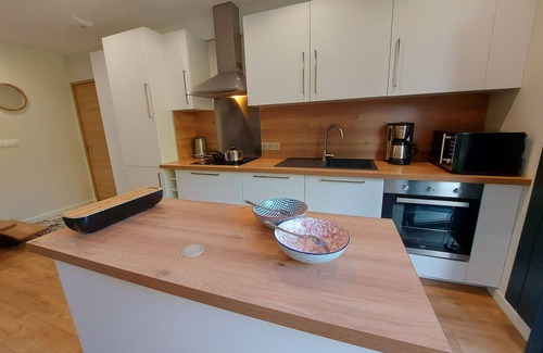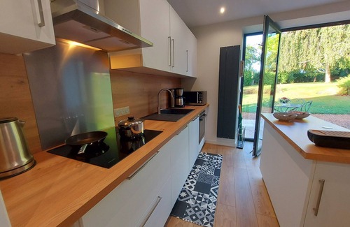 Surroundings: the towpath 6 km away (offers 85 km along the Mayenne), the castles in Mayenne, Laval, Lassay-les-Châteaux, Ste Suzanne, Fougères, Vitré, as well as the characterful villages of Fontaine-Daniel and Chailland, the Gallo-Roman site of Jublains, the Museums, the Jardin des Renaudies, Le Refuge de l'Arche, the most visited site in Mayenne, the Caves of Saulges. And 1h30 by car to Mont-Saint-Michel! Gîte on 2 floors - LEVEL 0 - a large living-dining room (36m²) with a fully equipped kitchen area offering dishwasher, refrigerator, freezer, microwave, toaster, filter coffee maker, oven, induction hob, plancha. A living-dining area: Orange TV, 110cm, sofa and armchairs. Separate WC in a very spacious shower room (linen).