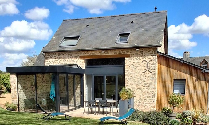 L'atelier des hirondelles, a highly personalized cottage, entirely decorated and furnished by Odile and Daniel, the owners. They are committed to providing you with exceptional service. A charming detached stone house with a contemporary veranda terrace overlooking a wooded, unoverlooked site. Fiber optic Wi-Fi is available throughout the property.