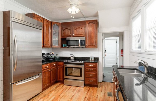 Our cottage features a large living room with a Toshiba 50-inch Smart 4K TV. It has a fully updated modern kitchen with an attached dining room and an additional sun room. The kitchen has been fully renovated and has beautiful wood cabinets and brand new appliances. It has 3 bedrooms and 2.5 bathrooms. The primary bedroom has a gorgeous king bed with an en-suite bathroom with double vanities and a walk in shower. The primary bedroom has a 43" Samsung 4K HD Smart LED TV. The upstairs features two bedrooms each with a queen bed and a half bath. There is another full bathroom on the main floor. One bedroom upstairs features an alcove with an additional twin bed.