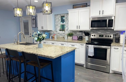 All 3 bedrooms are equipped with 32" roku tv's, nightstands with usb to conveniently charge your electronics. The master bedroom has a cozy queen bed with a private shower and bath, his and hers sinks, and walk in closet. The 1st guest bedroom has 2 comfortable twin beds with modern wall art and walk in closet. The 2nd guest bedroom has a cozy full bed with walk in closet and view to the backyard patio and beautiful landscape.