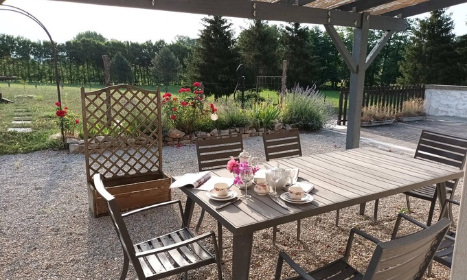 This former dairy, built on maturing cellars, also offers two terraces: one on the old quay, below, facing the century-old plane trees, and one with a pergola overlooking the sunrise, overlooking the park and pond, adjacent to the accommodation. Private parking. Ping-pong, foosball, and swings.