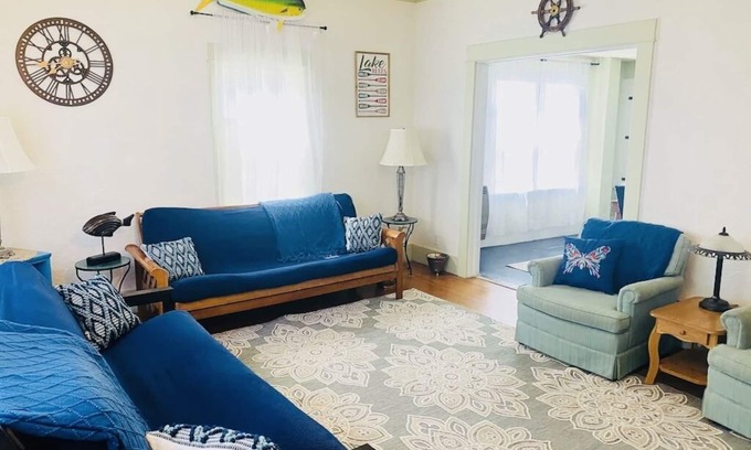 This charming 1930s house rental is for the main level of house. This includes two bedrooms, one with a bunk bed to sleep two and the other with a full bed to sleep two more.