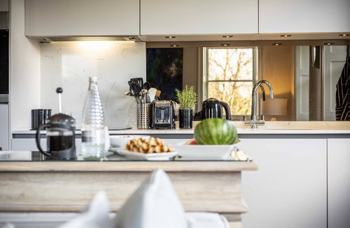 Neatly arranged and stylishly furnished, this compact apartment offers a cosy retreat in the heart of the city. The pretty open-plan kitchen and living room has a dual aspect with two sets of sash windows overlooking an elegant Georgian terrace and a tree-lined city park. The living area has a sofa for 2 and a comfy armchair. On a carved white sideboard is a TV, DVD along with Wi-Fi, with a stored selection of books, games and films.