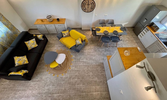 Charming LOFT-style cottage of 75 m2, with its sleeping area, bathroom and toilets and its main room of approximately 30 m2, with its fully equipped kitchen, its dining area and its lounge area with connected TV with a beautiful height under ceiling which overlooks a mezzanine of 20 m2 where is installed a 160 bed, a 90 bed and its office area which brings the accommodation to a reception of 5 people comfortably installed.