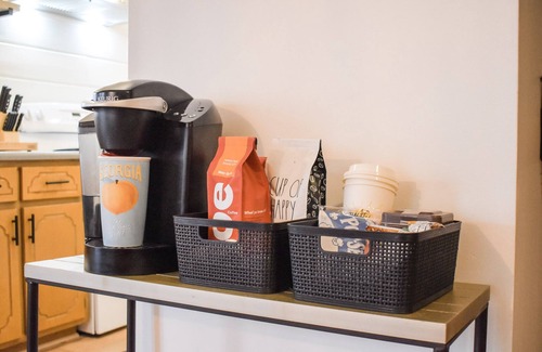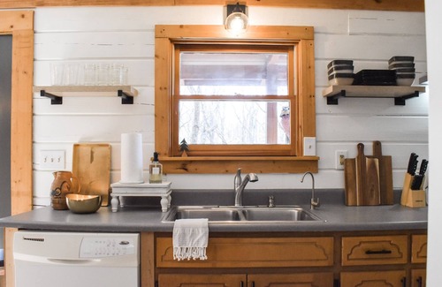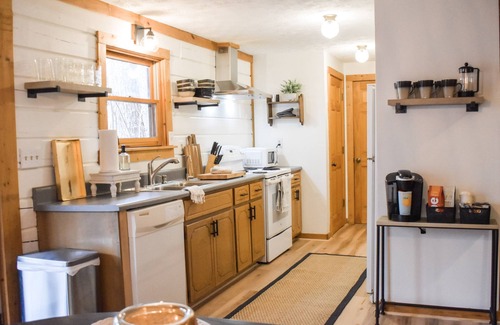 Whether you're exploring nearby nature and attractions or enjoying the gorgeous mountain view from the comfort of the back porch, you're sure to fall in love with this Modern Luxury Log Cabin! Get unplugged but not uncomfortable - we have all the comforts of home and then some. Guests will appreciate the newly remodeled spaces and redesigned amenities we have to offer including two private King bedrooms, one loft Queen bedroom, two full bathrooms furnished with luxury linens, a full kitchen and laundry area with necessities provided, and a SmartTV with streaming video services. Plenty of comfortable outdoor living space to enjoy the wooded views on the porch or around the fire pit under the twinkling lights. Don’t worry about getting your caffeine fix - we have a coffee bar set up for you! Check out the nook under the staircase for some books and games suitable for all ages.
