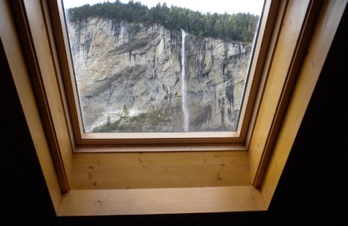 This brand new spacious penthouse apartment is the perfect holiday getaway with magnificient views into Lauterbrunnen Valley and the Breithorn. The large bedroom has a king size bed to comfortably sleep two and comes with parquet flooring. Another two guests can be added on the pull out couch in the sitting room. The sitting/dining area is tiled and the apartment has underfloorheating. The balcony has georgeous views into Lauterbrunnen Valley as well as to the Breithorn. A special view is featured by the skylight looking direktly on the famous Staubbach fall. High ceilings and wooden beams give the apartment a spacious but comfortable swiss chalet style feel.