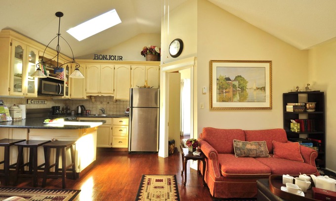 Our cottage contains one bedroom with a queen-size en-suite and access to a patio garden. The bathroom is equipped also with a washer and dryer. A full-size kitchen with all stainless steel appliances includes a microwave, toaster, coffee maker, and much more. The living area has a fireplace, comfortable sofa-bed, two love seats, cable TV/DVD,