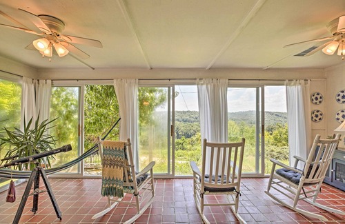SUNROOM: Dining table, seating area, telescope, wooded views, hammock