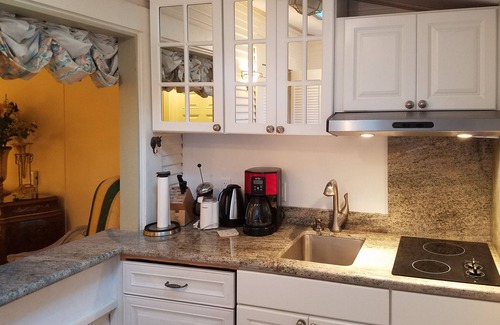 Free wif- and free parking. Large two-bedroom duplex cottage with front living room with a pullout sofa bed sleeps a single person in the front room. A king-sized bed in one bed room and a queen bed in the second bedroom. Single bath with historic claw-foot cast-iron tub with shower. Includes flat screen TV and granite-top galley contemporary kitchen complete with dishwasher, microwave, and two-burner ceramic glass cooktop. Front porch and terrace for quiet conversations and meeting the neighbors. Breakfast not included . Base price for 4 persons with additional fee for 5th guest using pull-out sofa bed. You may wish to get Travel Protection Insurance through CSA Insurance Company. They are the company that works with Homeaway. This specific insurance would protect you in case unexpected emergencies require trip cancellation.