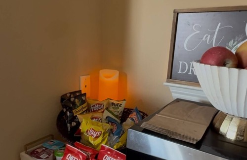 Experience the Tranquility Guest Suite with a cozy full sized bed, 1 twin roll away upon request, Full bath, and a lovely sitting area with a couch and table for additional space. Guests can enjoy amenities like AC, WiFi, and a hair dryer; as well as, free complimentary toiletries such as body wash, shampoo, conditioner, lotion, toothpaste, and more. The room is also stocked drinks in the refrigerator to make you feel extra welcomed. Enjoy!