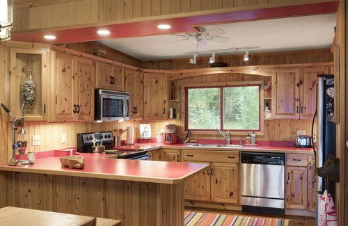 This two-bedroom, two-bathroom cabin is ideal for up to 4 guests. The kitchen comes with microwave and dishwasher and is well-stocked, including cookware, utensils, and spices outside a gas grill and charcoal grill (please bring your charcoal and lighter fluid). There is a screen porch with rocking chairs along with a large expansive deck. A wood-burning fireplace anchors the main room with a stack of dry firewood provided stacked next to the shed. A TV with premium cable channels is on-site along with highspeed WIFI and a landline phone.