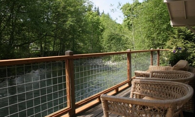 Enjoy the views of the water, lush forest, and wildlife from the large deck that nearly cantilevers over the creek.