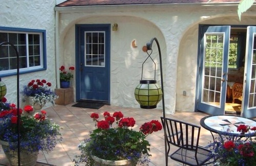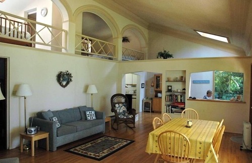 Built in 1949 by a master craftsman, the house is completely modernized but retains its original charm with lovely hardwood floors, beautiful architectural lines and exquisite stone masonry. The fully-equipped kitchen includes a range, microwave, refrigerator, dishwasher, two waffle irons and fine culinary tools (I love to cook!) The master bedroom has a king bed, a private bath with walk-in shower, and French doors that open onto a sunny terazzo terrace. Carpeted stairs lead to a mezzanine above the living room which has a king bed and double bed with a shared closet between. This is a loft which overlooks the living room, so it’s not completely private, but there are floor-length blinds that can be pulled down for privacy. A full bath with bathtub is at the foot of the stairs. The living room features a vaulted ceiling which gives an open feeling, and has a sofa that makes into a queen bed. Two dining room tables easily seat 12. A guesthouse is across the driveway from the main house and is included in the rental. It has a queen bed and a queen sofa bed, and 1 bathroom.