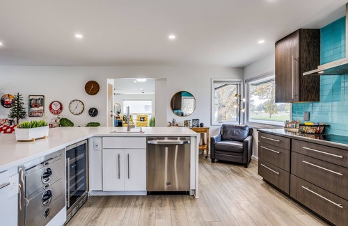 Designed by a Frank Lloyd Wright apprentice, our space boasts clean lines and modern design. Enjoy the gourmet kitchen with top-notch appliances, stunning sunrise and sunset views, a private backyard with a hot tub and pool, air hockey for rainy days, and a "Spa" bathroom.