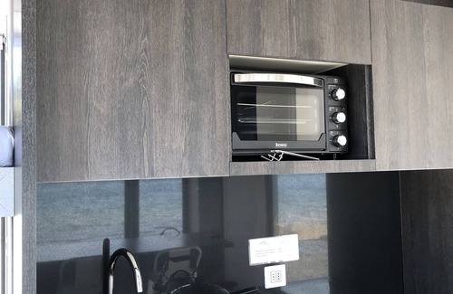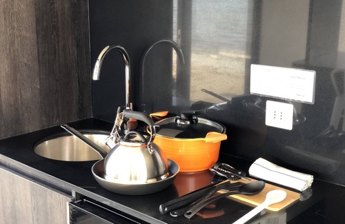 While you're here, you can enjoy all the comforts of home and more, including a rainfall showerhead and an oven, as well as a dishwasher and a private deck. Other amenities include towels, a mini-fridge, kitchenware and utensils, and a toaster oven.