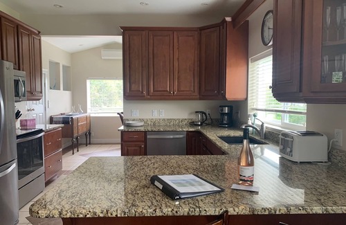 Fully renovated in 2013 the home has a fantastic kitchen with plenty of living areas in which to relax. This includes 2 patios, a comfortable siting area off the kitchen and a great living room. Both patios offer excellent privacy- the back patio is particularly nice for enjoying a bit of shade in the peak of summer. Additional features include A/C, plenty of natural sun light, a fireplace and 55 inch wall mounted flat screen TV for your enjoyment, dining room seating for 8 plus kitchen bar seating and bedrooms with fantastic beds. There is plenty of storage and personal touches throughout. We include free WIFI and cable TV.