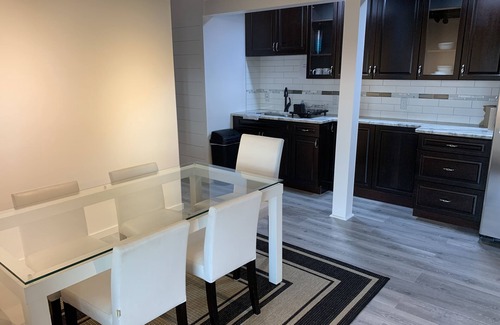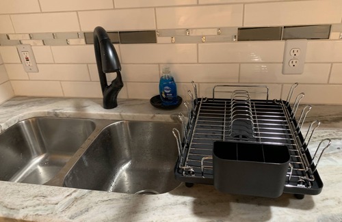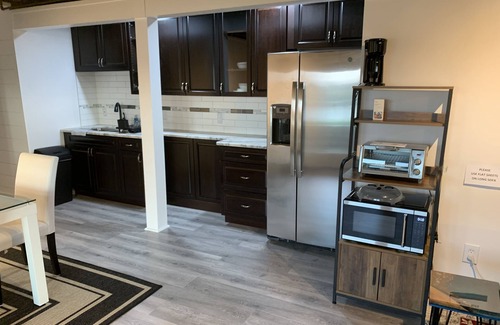 This space is a one bedroom with dining area, living area, kitchenette, deluxe air fryer / broiler / grill all in one countertop oven, a portable 2 burner stovetop, microwave, toaster oven, and full-size refrigerator. The unit also includes one private full bath with shower and a private office area including a sit to stand desk, office chair & a computer monitor. For longer stays guests have full access to their own washer and dryer.