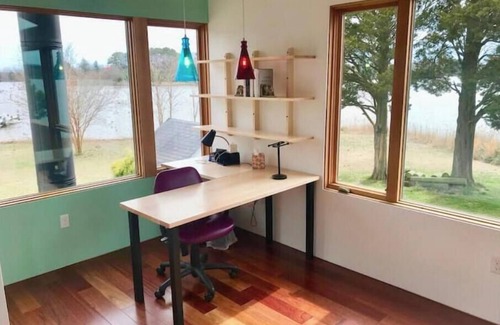 1350 square feet. Designed by Mark McInturff. Construction by James Cooper, completed in Spring 2019. Italian kitchen. Wood burning fireplace. Film quality projection screen and surround sound speakers. Upstairs cocktail deck. Downstairs triangle screen porch. Hand made wooden cabinets. Furniture designed by Frits Maas. Brazilian cherry floors and stairway. Painting by Olga Dorenko. Ceiling to floor windows surrounded on three sides by water. Private dock, kayaks, fishing, crabbing. No neighbor. Only sunsets and stars. Swimming pool and hot tub available. Copper Japanese soaking tub on second floor. State of the art electronics for watching films and streaming music. All new furnishings, kitchen equipment.