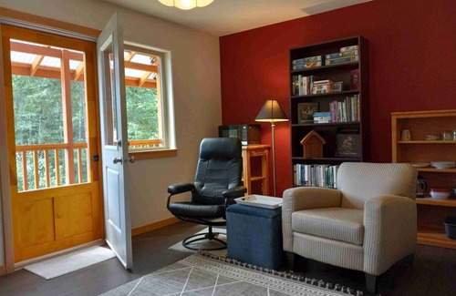 After a long day of exploring the island come back to Chez Claire and relax in our spacious private guest suite. Amenities include: THREE rooms: a separate bedroom with a queen bed and air conditioning: a full bathroom; AND a separate sitting room with Wi-Fi, coffee maker, microwave, kettle, ice, dishes and DVD player. Healthy breakfast items can be found in your refrigerator. Two private decks - one sunny, one shady. Guests can fill their water bottles or wash their dishes in the outdoor sink on the back deck. Hot plate available on request. Over 650 square feet of indoor and covered outdoor spaces. Five acres of walking trails. PRIVATE ENTRANCE. Scent free premises. Must be able to climb the stairs. Adult oriented. Sorry no pets. Located at 240 Irene Road off Lighthouse Road at the south end of Quadra Island - a 10 minute drive from the Q Cove ferry terminal.