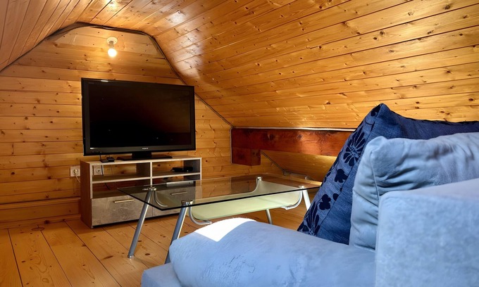 Relax in the cosy attic living room with a convertible sofa, television, and coffee table.