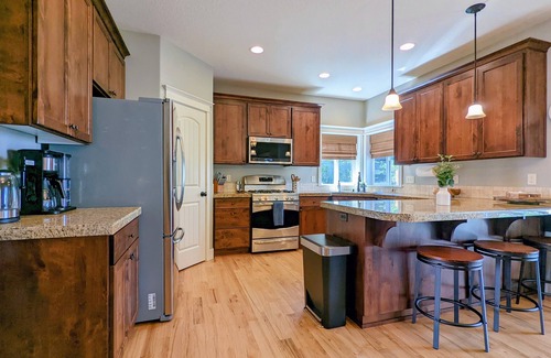Upstairs features all of the guestrooms, two full bathrooms, a loft movie room with sofa bed, and laundry room. The spacious master with en suite bathroom features a brand new king-sized bed, hotel-quality linens, a deep soaking tub for two and a standing shower, and a large walk-in closet. Twoadditional guestrooms reside upstairs both with new queen beds and luxury linens, lots of lighting, and offering a variety of seating and spaces for clothing storage. The guestrooms share a full bathroom with a shower/tub combo, super soft-n-fluffy towels, and luxurious bathroom amenities. A desk for work-from-home or school-from-home is available in one of the queen bedrooms.