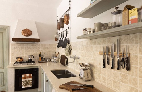 Guest house: The fully independent guesthouse was renovated first in the 1990s from a historic farm building for hanging and drying wild fennel, and then again in 2024 with the installation of a thermal window. Stone steps lead to the shaded terrace with table and reading chairs. The first floor includes a dining area, living room with sofa bed and fireplace, fully equipped kitchen and pantry. The air-conditioned bedroom is located on the upper floor with en suite bathroom and walk-in closet. The windows frame the cypresses, Castle and olive grove. Its an architectural jewel.