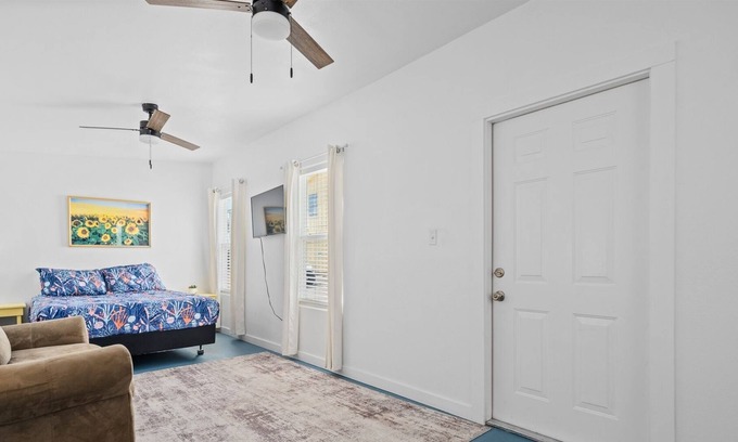 Come relax and unwind in this Coastal Chic Studio with walk in shower and small kitchenette. Smart TV for streaming, WIFI equipped. Located inside Rockport Cottage Company's south location this studio is the perfect hideaway.