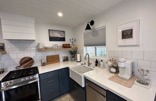 Inside the cottage, you'll find inviting hardwood floors throughout, adding to the beachy charm. The kitchen is fully stocked and equipped with top-of-the-line amenities, including a retro Lio fridge, a modern GE range, and a dishwasher, all of which add convenience to your stay. Cooking becomes a pleasure as you create culinary delights with this well-appointed kitchen. Ample storage space ensures you can unpack and settle in comfortably, making it feel like a home away from home. For added convenience, there is a washer and dryer shared with the top unit, allowing you to pack light and enjoy fresh laundry whenever needed. The cozy working fireplace adds a touch of warmth and ambiance, while the smart TV mounted above makes it the perfect spot for relaxing evenings.