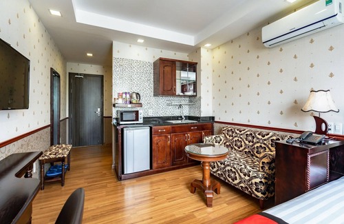 Comfortable Accommodations: Collection O Emerald Luxury Hotel & Apartment in Ho Chi Minh City offers comfortable rooms with air-conditioning, private bathrooms, and city views. Each room includes a dining area, refrigerator, and TV. Essential Facilities: Guests enjoy a garden and free WiFi. The hotel features a lounge, 24-hour front desk, housekeeping service, outdoor seating area, full-day security, tour desk, and luggage storage. Free parking is available. Prime Location: Located 7.5 mi from Tan Son Nhat International Airport and 1.2 mi from Saigon Exhibition and Convention Center. Nearby attractions include Nha Rong Wharf, Fine Arts Museum, and Ben Thanh Street Food Market. Highly rated for room comfort and cleanliness.