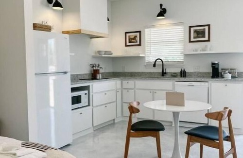 Professionally designed, the space features polished concrete floors, a queen-sized bed, a modern kitchen with stovetop and complimentary coffee, a dining table, fast wifi, a 40" TV, loveseat, private back patio, and a sleek bathroom.